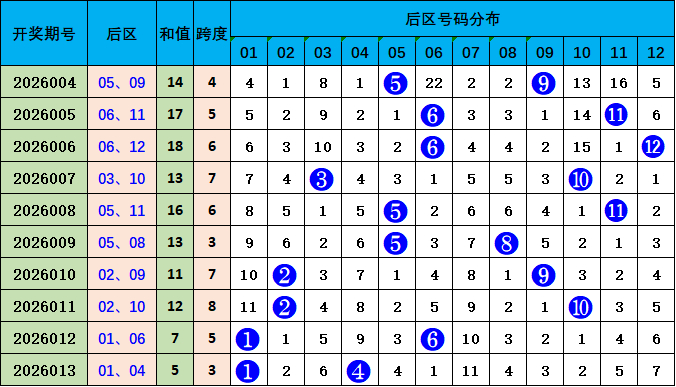 后区走势分析:上期开出01 04,开出和值5,较前一期和值着落2个点位变化,本期展望和值高潮,参考号码05 11,和值16。