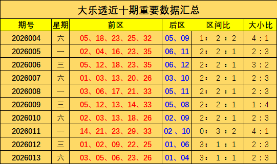 大乐透上期出奖号统计:前区03 05 06 23 26,后区01 04,三区比为3:1:1,大小比为2:3。