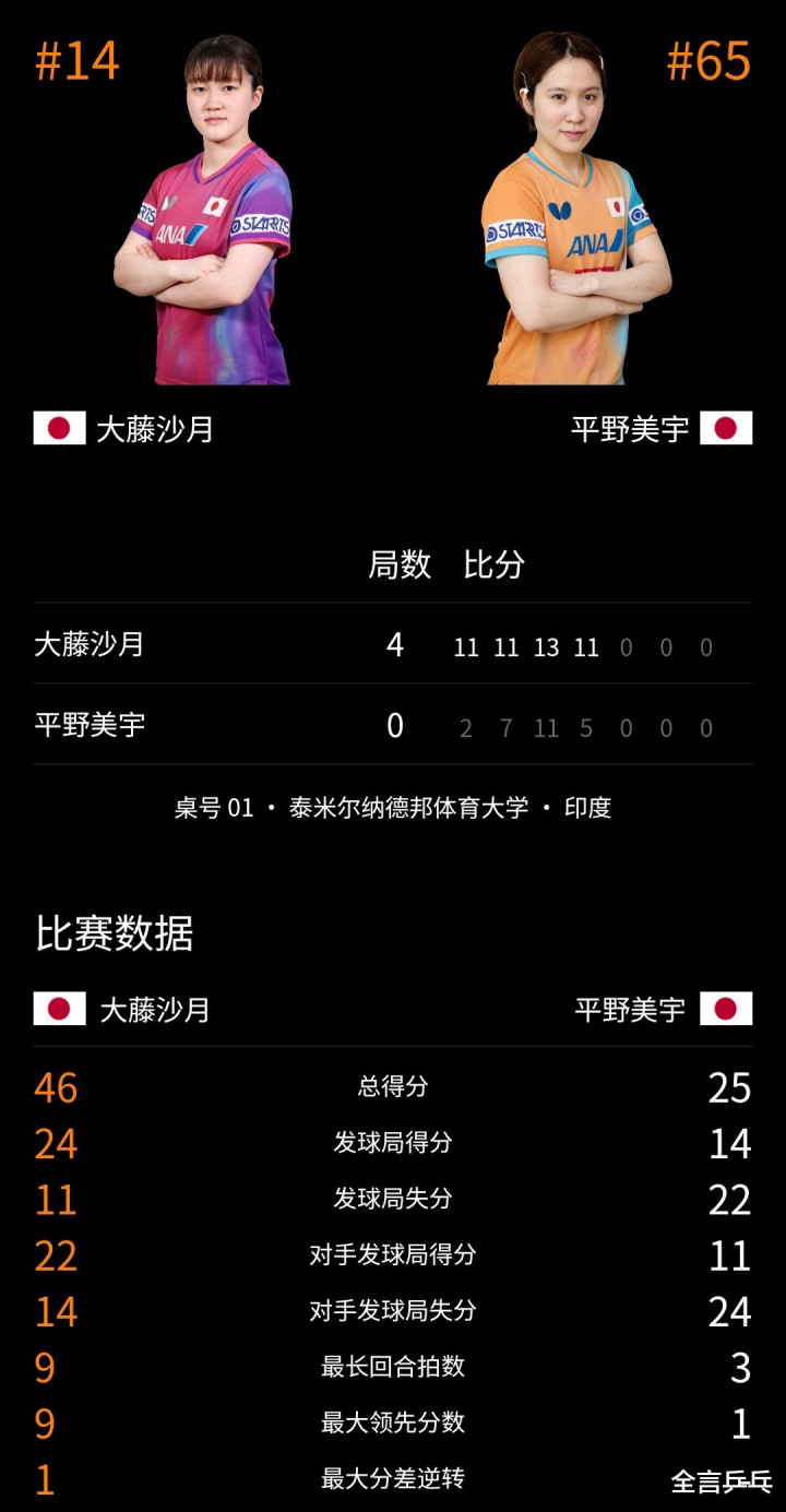 比赛开动后,大藤沙月当先发动获得上风,平野好意思宇在首局无理较多,天然我方的反手实力隆起,但对方在这个步调并不输对方,正手更是彰着占优,此外发接发、前三板上皆更胜一筹,很快便10-2教授拿到多达8个局点,最终大藤沙月以11-2浮松拔得头筹。
